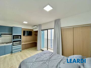 Condomínio residencial de STUDIOS, com 120 unidades, lazer e serviços. Exatamente em frente ao Aeroporto de Congonhas. Distante 40 metros da passarela sobre a Av. Washington Luís - acesso ao aeroporto. Imóvel novo, prédio recém entregue (2º semestre 2022). Apto 1104 -11º andar - vista para o bairro de Campo Belo Studio p/ pronta ocupação, TOTALMENTE MOBILIADO e EQUPADO. Repleto de planejados, cortina, Iluminação em LED. Sala com bancada p/ trabalho e varanda com vista para o bairro. TV LED 40" e ar condicionado split. Cozinha com geladeira 2 portas, fogão coock-top indução, coifa, fornos micro-ondas e elétrico. Cama de casal box com cabeceira e guarda-roupas 2 portas. Banheiro com box de vidro e armário sob a pia. 1 vaga na garagem mais estacionamento rotativo para visitantes