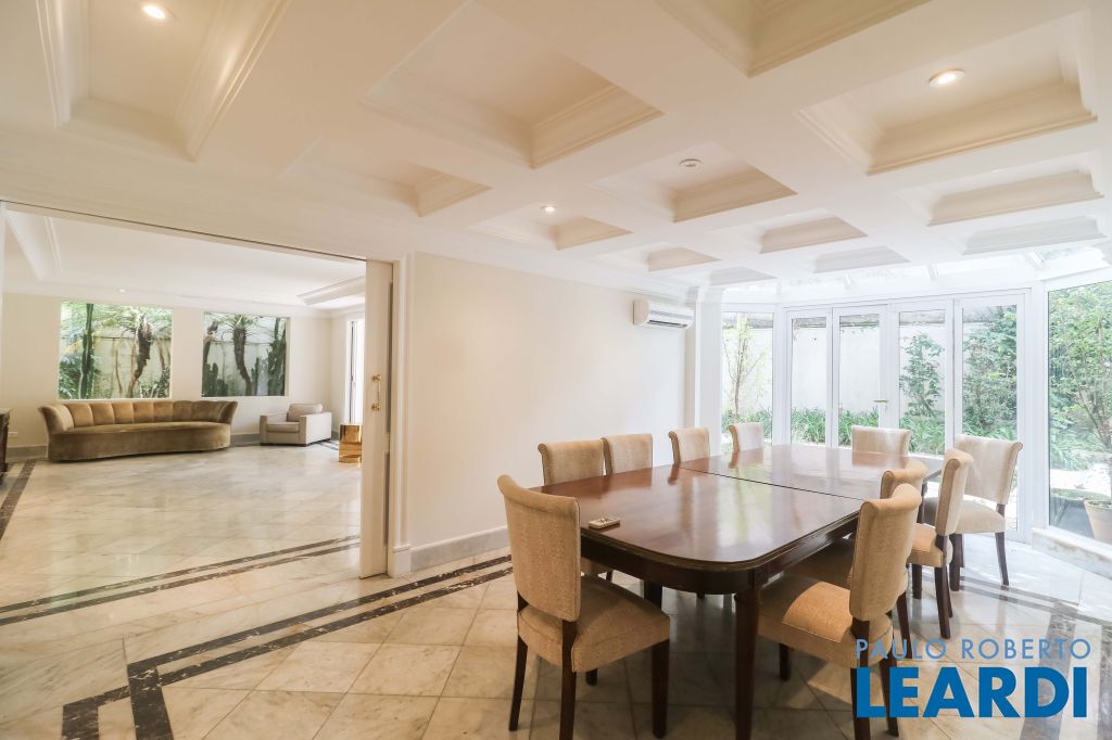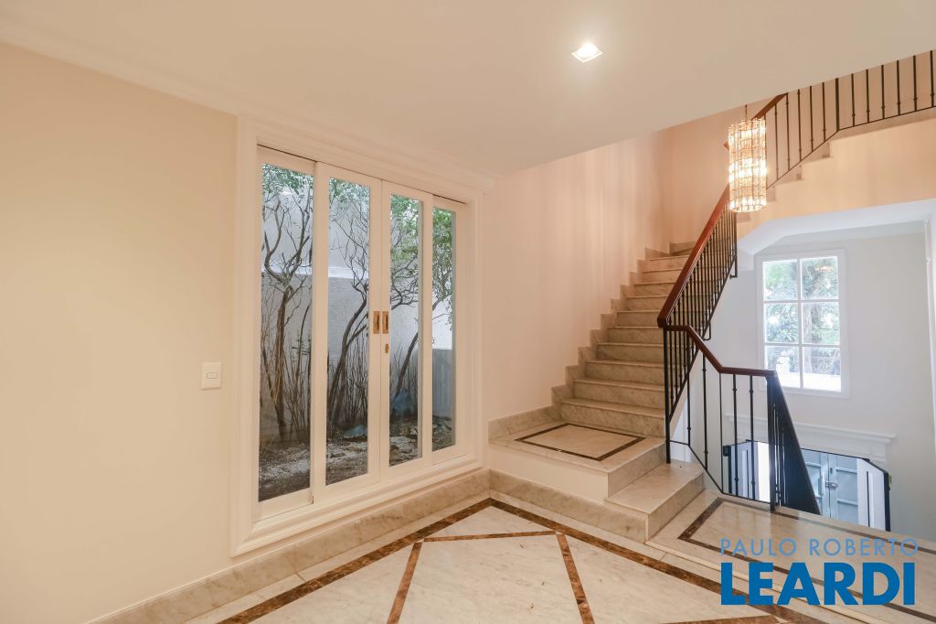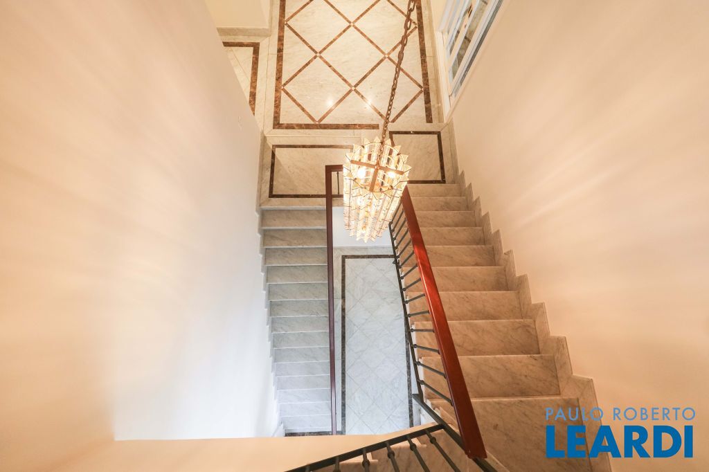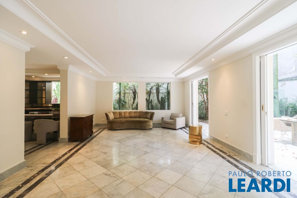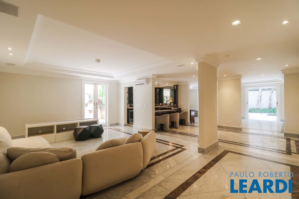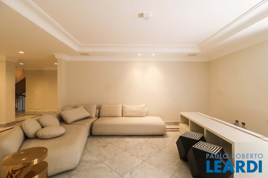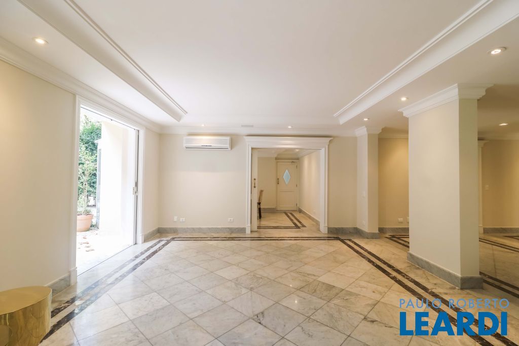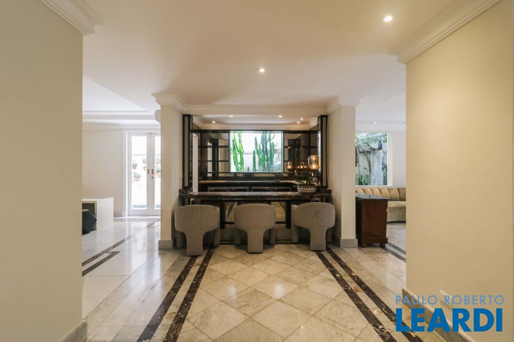 Acabamentos nobres, classe e sofisticação numa rua calma e arborizada. Ar condicionado em todos os ambientes. Portas blindadas. 578m² terreno 722m² área construída Hall de entrada com pé direito duplo em mármore Amplos livings 2 lavabos Escritório Copa Cozinha 4 suítes sendo 1 master, todas com marcenaria impecável Family room Academia Piscina Área gourmet Sauna em vidro Ampla área de serviço 2 dependências para funcionários 1 banheiro para motorista Garagem para 8 carros