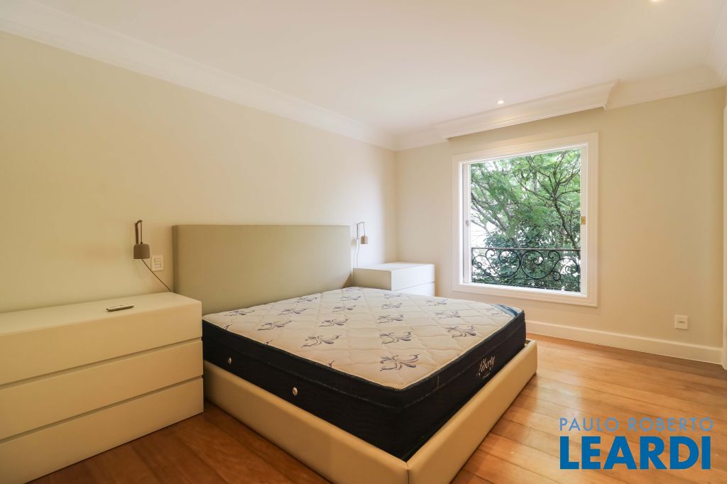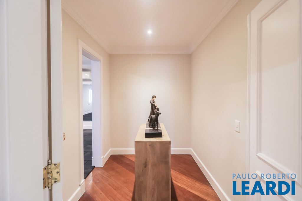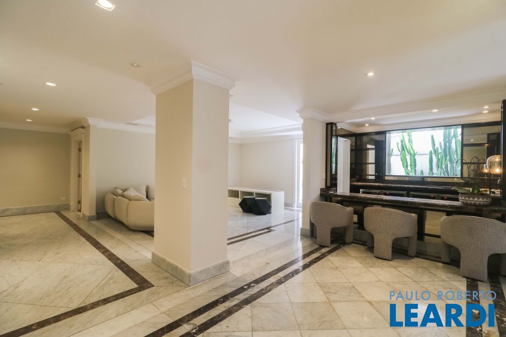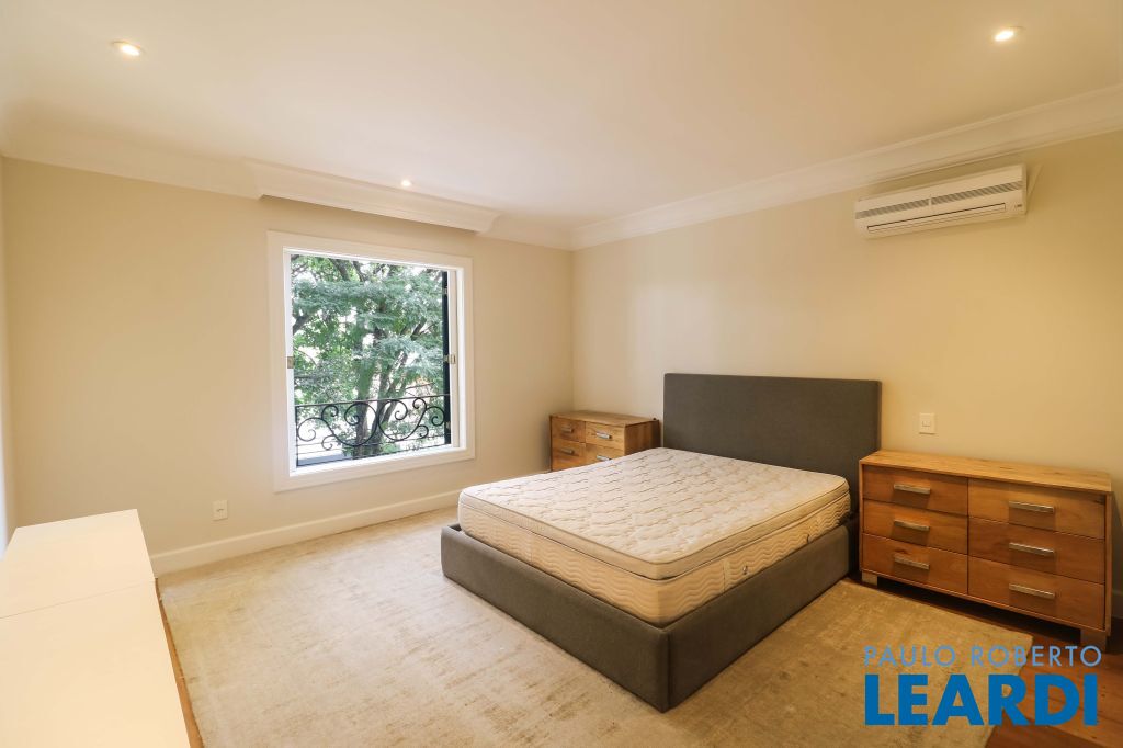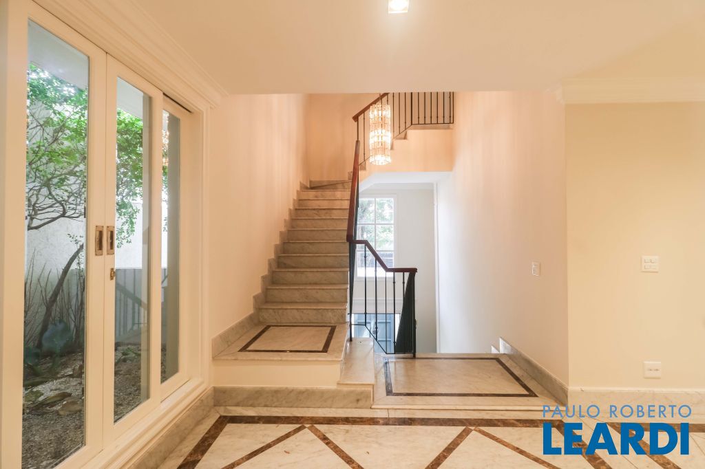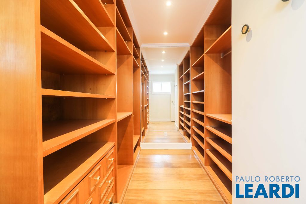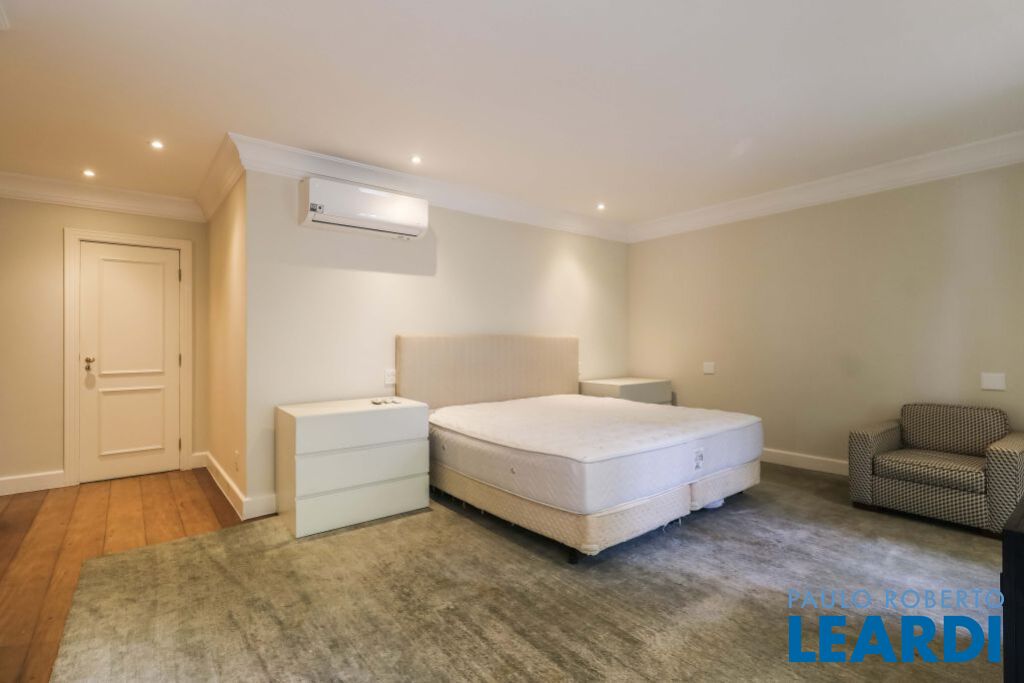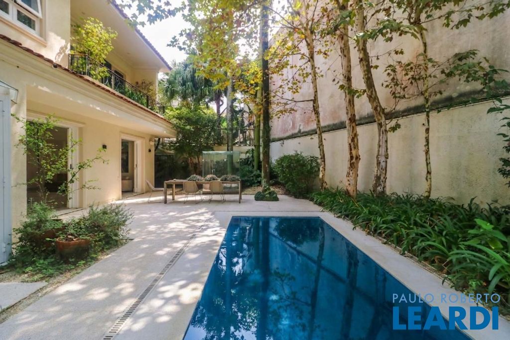 Acabamentos nobres, classe e sofisticação numa rua calma e arborizada. Ar condicionado em todos os ambientes. Portas blindadas. 578m² terreno 722m² área construída Hall de entrada com pé direito duplo em mármore Amplos livings 2 lavabos Escritório Copa Cozinha 4 suítes sendo 1 master, todas com marcenaria impecável Family room Academia Piscina Área gourmet Sauna em vidro Ampla área de serviço 2 dependências para funcionários 1 banheiro para motorista Garagem para 8 carros