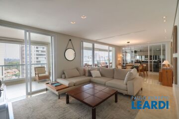 Apartamento amplo, com muita luz natural, em rua plana e arborizada. 300m² - área privativa Lavabo Varanda integrada com Living integrado com varanda, sala de estar, home theater e sala de jantar Escritório 4 Suítes Copa Cozinha 3 Vagas